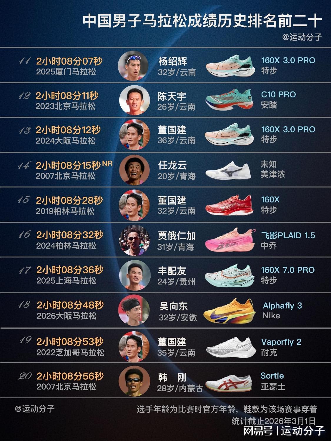 更早的前辈,任龙云、韩刚、胡刚军(刚被挤出3月的新榜单)都是传统跑鞋。不妨想象下,如果他们的巅峰期有超级跑鞋加持,成绩能达到怎样的高度。