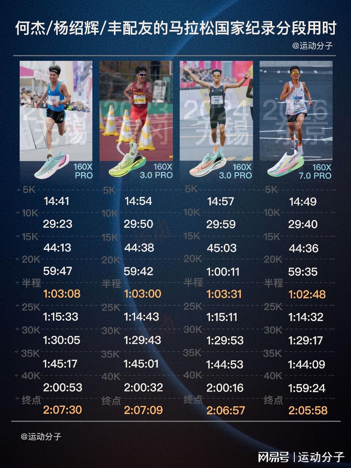 ——何杰、丰配友、杨绍辉、吴向东、陈天宇、董国建、贾俄仁加这些现役选手都赶上了超级跑鞋时代,成绩也都由碳板竞速鞋创造。